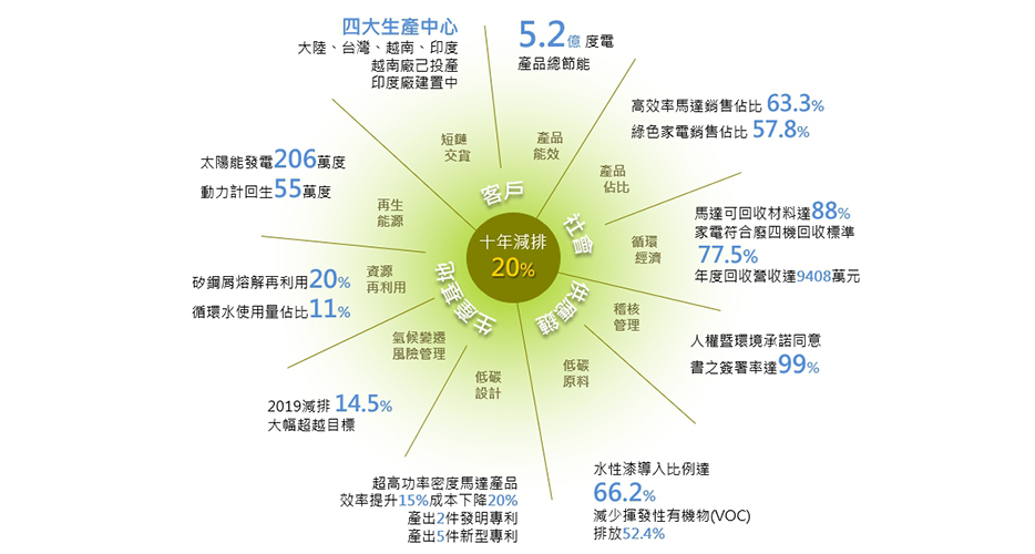 由于全球暖化,溫室效應已對全人類產生沖擊,東元以「節能、減排、智能、自動」的愿景領先「國家溫室氣體減量目標」,從原料供應鏈、高效率產品設計及生產制程進一步檢視、監控,期能由內而外,由上而下,達到整體產品生命周期及供應鏈綠化之目標。針對管理方式及目標,東元宣示「十年減排20%」,基準年設定為2015,目標在2025年時降低20%的碳排放,比國家目標高出兩倍,直追歐盟2050年零排放水平,維持國際級競爭力